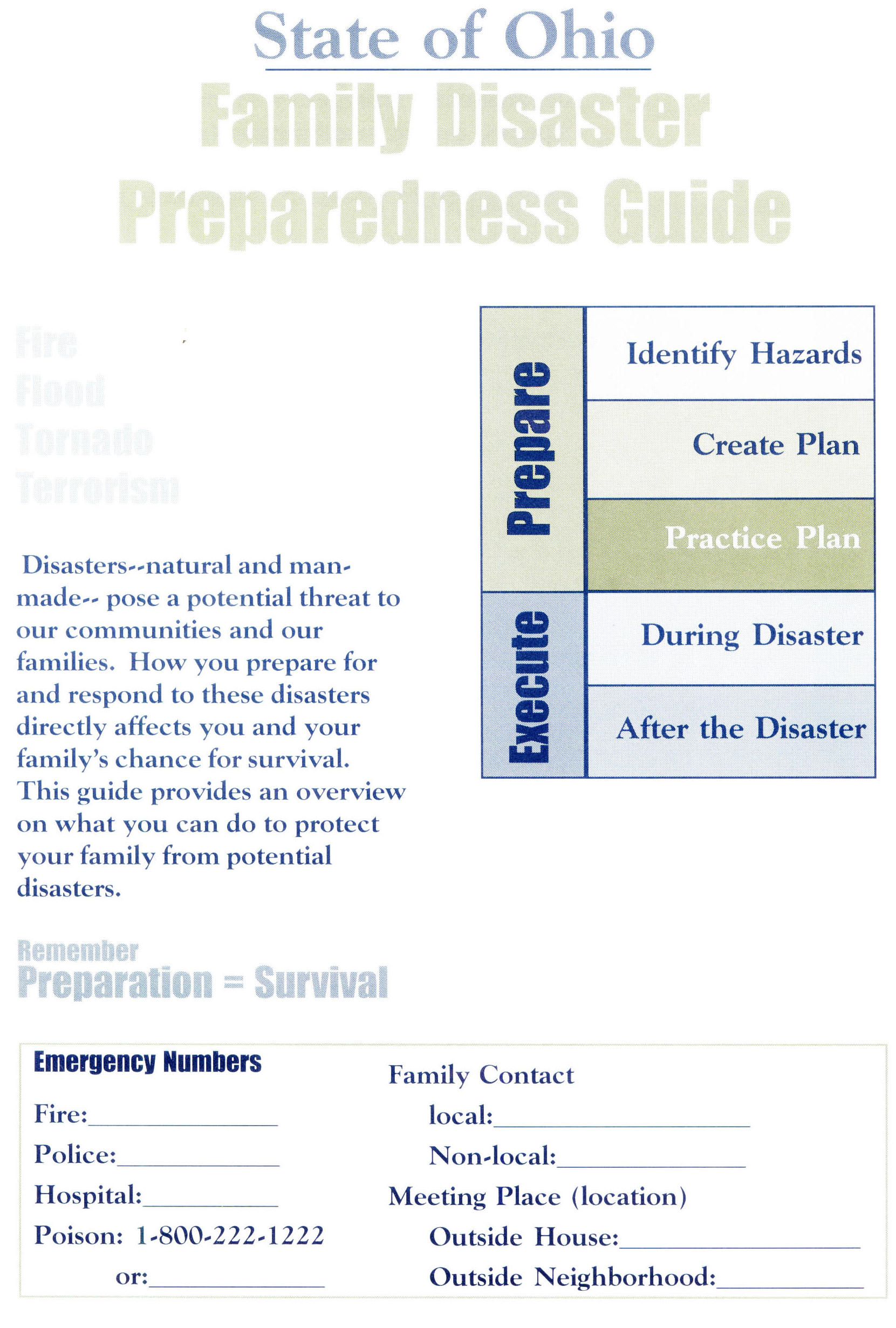 On October 31, 2002 staff members of the Franklin County Sheriff's Office, attended a Family Disaster Preparedness Seminar, sponsored by the State of Ohio Task Force. The Family Disaster Preparedness Guide was made available to the attending agencies. We believe it is a important document and are making it available online for all who would like a copy.